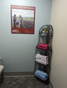 Meanwhile, BMG is doing what they can to encourage women to make their screening appointments,” said Kayla Ellis, RT(R)(M), Imaging and Cardio-Pulmonary Manager. “We know that women appreciate a calm environment, so we focused on enhancing the esthetics of our women’s health center. We partnered with the AKG Art Museum to fill the walls with beautiful artwork. We provide each patient with a gift bag that contains unscented, aluminum-free deodorant to use after the exam, along with chocolate and mints. Our new Keurig machine allows women to enjoy hot cocoa, tea, and coffee while they wait. Rooms are dimly lit, and women can choose the type of gown they would like to wear — either a full-length gown with armholes, a maroon, pink-lined t-shirt kimono, or a shoulder cape that is white with pink and purple squares. There also aren’t any men walking through the center,” said Kayla.