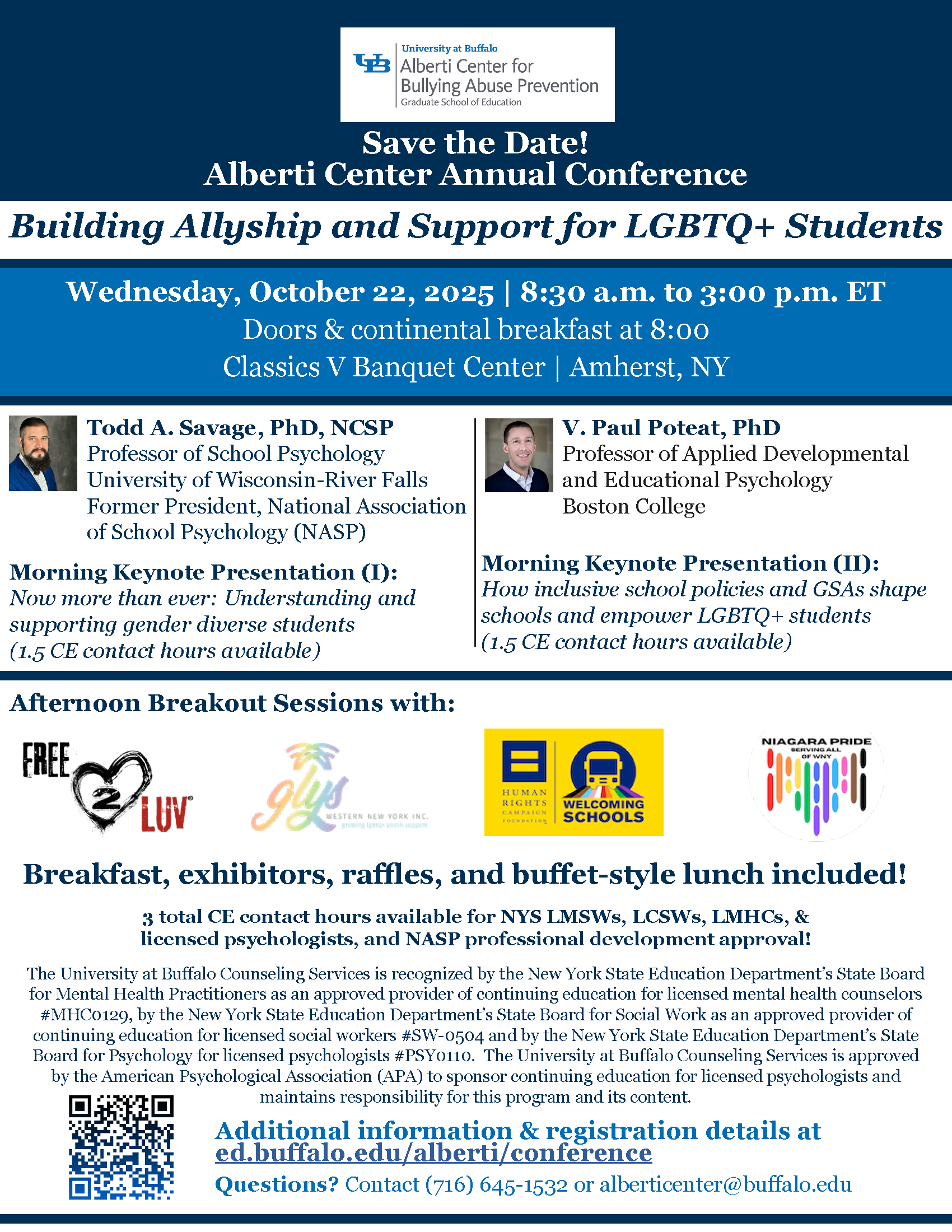![]() Building Allyship and Support for LGBTQ+ Students Two morning keynote presenters: (8:45-10:15 a.m.) Now More Than Ever: Understanding and Supporting Gender Diverse Students Todd Savage, PhD, NCSP, Professor of School Psychology | University of Wisconsin-River Falls Former President, National Association of School Psychologists (NASP) (10:30-12:00 p.m.) How Inclusive School Policies and GSAs Shape Schools and […]