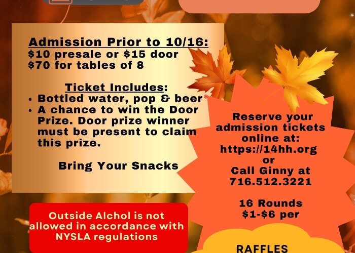 ![]() Fourteen Holy Helpers Church will host a Fall Meat Raffle from 6 to 10 p.m. Saturday, Oct. 18th, in its Msgr. Ebner Parish Hall, which is located at 1345 Indian Church Rd., West Seneca. Presale tickets are only $10, and include pop, water & beer, as well as a door prize chance. Guests may reserve tables […]