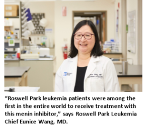 “Roswell Park leukemia patients were among the first in the entire world to receive treatment with this menin inhibitor,” she adds. “That’s because the trial is part of the Early Phase Leukemia Clinical Trials program, funded by donations to the Roswell Park Alliance Foundation, which provides dedicated resources to bring the most promising and innovative experimental agents to leukemia patients here in Western and Central New York.”