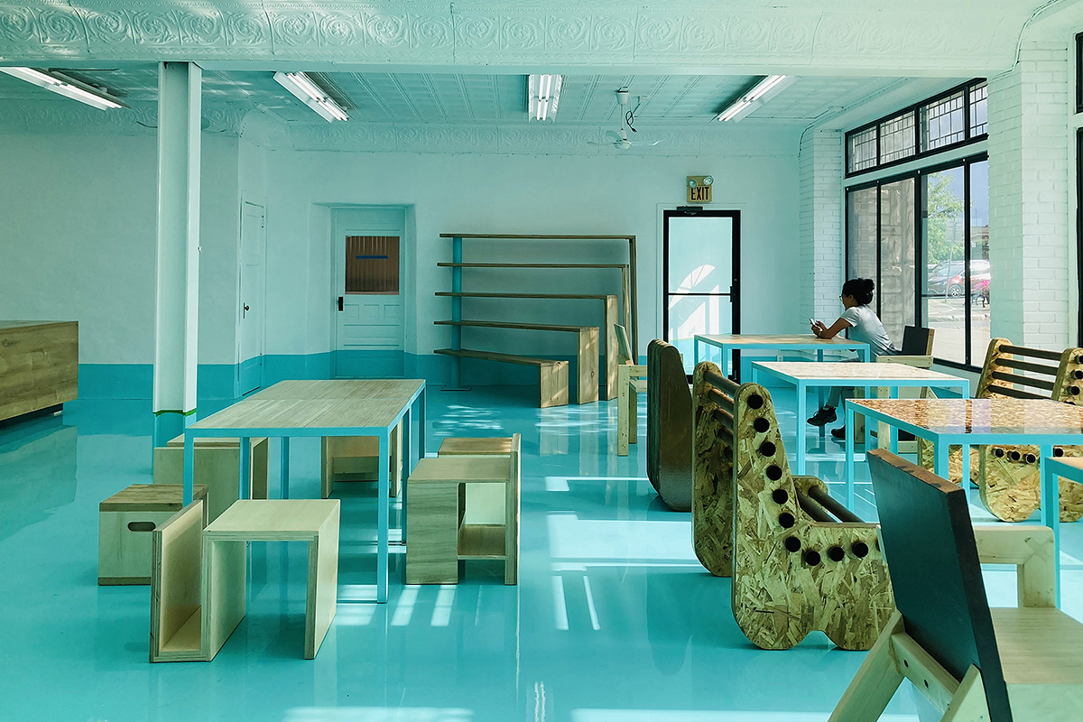 A teal coloring goes 15 inches up the pillars and walls of the Medina Triennial Hub space, representing the rise and fall of the canal; hence, some of the furniture created has teal accents.